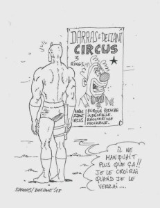 Malheureusement (et là j’écris « malheureusement » pour vous), un voyage nous mena à l’étranger aux fins de rencontrer divers artistes de comics (c’était avant internet, vous voyez que je n’exagérais pas quand j’écrivais « Il y a quelques années… »). Il ne nous fallut qu’une poignée de minutes de vie commune pour nous apercevoir que nous partagions le même sens de l’humour fin, spirituel, élégant. Alors que nous rentrions en France avec de longues interviews sur bande, nous avions acquis la certitude que nos stylo et crayon étaient fait pour s’entendre, et nous avions de quoi réaliser une tripotée de crobards associant jeux de mots douteux et dessins crades.