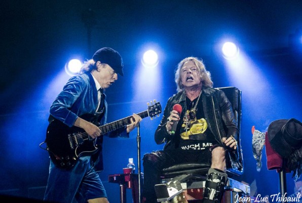 Les rageux avaient prévenu, avec Axl, AC/DC arrivera sur scène avec 2 h de retard. Alors que les gradins et la pelouse se blindent, c’est pourtant à 20h45 pétantes que l’intro démarre, cette vidéo spatiale très fun qui voit AC/DC s’écraser sur terre, là, devant nous, sur scène. Les premiers accords de « Rock or Bust » emplissent alors le stade, et les deux questions existentielles qui hantaient l’esprit des spectateurs depuis quelques jours trouvent réponses : Angus Young porte son costume bleu, et Axl a toujours le pied gauche dans une attelle le contraignant à rester assis. Alors que certains groupes démarrent leurs shows à 2000 à l’heure, AC/DC sur cette tournée commence à la cool, limite plan-plan. Axl n’est pas trop sollicité sur ce titre. Visage dégagé, cheveux au vent, sur son axelmobile à roulettes, devant l’avancée qui permet à Angus de s’approcher du public de la « pelouse Or », il assure son rôle de remplaçant mi-humain, mi-Dalek. Mais dès le deuxième titre, « Shoot to thrill », se produit alors ce que chaque fan présent ce soir espérait. Personne ne souhaitait bien évidemment l’absence de Brian Johnson. Il est dans tous les esprits. Et Axl n’a ni sa voix, ni celle de Bon Scott, l’idôle des (moins) jeunes. Mais il donne ce que l’on attendait de lui : le frisson ! Dès cet instant, c’est gagné pour lui. Malgré un son très (trop?) aiguë, AC/DC joue à nouveau en accordage standard, un poil plus rapidement que l’année dernière, et ce que le groupe perd en précision, il le gagne en énergie. Bien sûr, Cliff Williams (basse) et Steve Young (guitare rythmique), jouent toujours au fond de la scène, de part et d’autre de la batterie de Chris Slade, et ne s’avancent que pour assurer les choeurs. Mais la STAR, celui qui virevolte sans se soucier de ce qui se passe derrière lui, malmenant sa Gibson, jouant avec le public, c’est Angus. Celui qui paraît si vieux et rabougri en interview, et si jeune et gigantesque sur scène. La première moitié de la soirée reste assez conforme aux shows que le groupe donnait avec Brian. « Hell Ain’t A Bad Place To Be », « Back In Black », « Got Some Rock & Roll Thunder », « Dirty Deeds Done Dirt Cheap », « Rock ‘N’ Roll Damnation », « Thunderstruck », « High Voltage », « Rock ‘N’ Roll Train » et « Hells Bells », AC/DC enquille les standards, avec un avantage certain aux titres de Brian (7) contre ceux de Bon (4). Axl n’est pas arrivé dans le groupe par hasard, c’est à la base un fan, mais surtout de la période « Bon scott » dont il se sent plus proche du registre. Curieusement, il s’avère plus respectueux du répertoire de Brian, et s’astreint à le reproduire au mieux, avec un talent… bluffant. Malgré tout, malgré cette application et le talent d’un Axl qu’on ne se souvient pas avoir entendu aussi en voix, l’ensemble est presque trop respectueux et il manque un peu de folie. Axl sait que tout un stade guette le moindre faux-pas de sa part, comme il scruterait du regard la prestation d’un funambule œuvrant sans filet. Alors oui le frisson est là, mais on attend plus ! Et puis soudain le concert bascule. La cloche rangée backstage, le groupe se lance dans une interprétation de « Given the dog a bone » que l’on qualifiera d’« à la one-again », mais qui fait diablement mouche ! Un souffle rock’n’roll transperce alors le Nouveau Vélodrome, et ne fait que croître ! « If You Want Blood (You’ve Got It) » joué pour la première fois depuis 2003, et l’on se demande s’il n’y a que les vieux cons présents ce soir pour comprendre la logique du choix d’Axl… « Sin City » et le solo d’Angus avec….sa cravate !, « You Shook Me All Night Long », « Shot Down In Flames », « Have A Drink On Me », « T.N.T. » et les « Oïe ! » d’Angus au micro, « Whole Lotta Rosie » et « Let There Be Rock» ! Cette partie du concert est tout Bonne Mère, pardon, tout bonnement « phénoménale » ! Axl entame « Whole lotta Rosie » très bas pour pouvoir envoyer salement un « You could say she’s got it all !!!!!! » ultra puissant de folie au moment même où les écrans géants captent le visage radieux de Cliff Williams. Quant à « Let there be rock », ce titre est LE morceau qui clôture le show et permet à Angus de les enterrer tous, avec son solo sans fin sur un promontoire au milieu de public, sous une pluie de confettis. Puis enfin, alors que tous les membres du groupe ont disparu – est-ce une allégorie ? – Angus surgit sur le mur d’amplis qui orne le fond de la scène pour un final en solo, qui nous ramène à l’album live « If you want blood ». Cela fait deux heures que le diablotin bleu ensorcelle la foule. Une foule subjuguée, une armée d’adorateurs, une communauté de fans heureux, transportés. Enivré, le stade réclame un rappel qui ne tarde pas à venir.