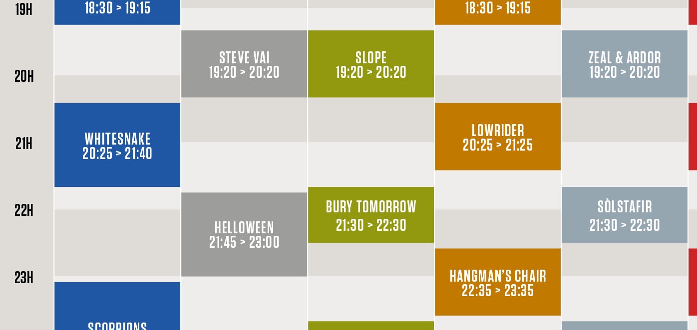 Peut-on aller au Hellfest pour un seul groupe ? Le peut-on « raisonnablement » ? Et ça veut dire quoi, raisonnable ? C’est acté, nous irons donc le jeudi du deuxième weekend. Parce que sept jours pour Whitesnake uniquement, c’était peu justifiable. Voyons donc ce que nous réserve cette courte journée de jeudi par ailleurs…. Le programme de la mainstage 1, c’est un peu un avant-goût des soirées karaoké en EHPAD d’ici dix ans : Phil Campbell, Thunder, U.F.O., Whitesnake et Scorpions. On se demande souvent qui remplacera ces dinosaures le moment venu. La réponse n’est pas très compliquée : il sera plus judicieux de supprimer l’une des deux mainstages, car leur public aura disparu aussi ! A moins que d’ici là Ben Barbaud et ses ingénieurs BTP ne construisent une structure pérenne sur le site pour accueillir le 3ème âge (ne riez pas, l’imagination des organisateurs est sans limite ! – Vous l’aurez lu ici en premier, souvenez-vous en ! – ). Quant au reste de l’affiche, forcément par nature moins consensuel, il y a de quoi passer de bons moments, ne serait-ce qu’avec Steve Vai, Helloween, LDDSM, Hangman’s Chair, Jerry Cantrell, Zeal & Ardor, Crown, Tribulation ou encore Septicflesh pour n’en citer que quelques uns ! Mais surtout ne pas oublier que nous n’irons QUE pour Whitesnake. C’est pourquoi dans le même temps j’imprime le running order en bâtonnant au marker tous les groupes que je ne veux pas voir afin de ne pas me disperser. Cela donne deux feuilles noires avec quelques rares fenêtres de couleurs, beaucoup moins qu’il n’en a d’ouvertes sur la pochette du vinyle de Physical Graffiti ! Deux feuilles car histoire de rentabiliser le déplacement en Loire-Atlantique, je convainc ma femme [enfin, je pense la convaincre] de rester sur le site le vendredi afin de voir Killing Joke, Ministry et NIN. C’est surtout un prétexte pour traîner sur le festival et tâcher de rencontrer le plus d’amis entre deux concerts, ce que je me jure de ne pas transformer une fois sur place en « au lieu d’aller voir les concerts ». Qui sera là ? Se reconnaîtra-t-on, trois ans c’est long quand même ? La grande communauté du Metal aura-t-elle survécu à la pandémie ? Faut-il faire régime pour ne pas paraître trop boudiné dans sa collection de t-shirts ?
