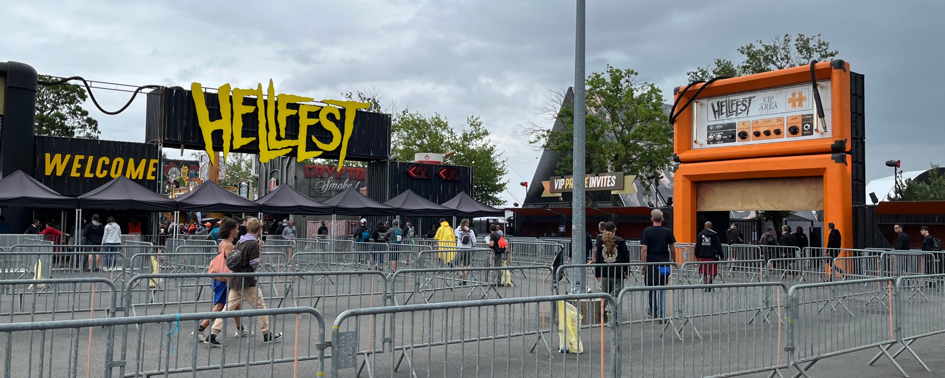Jeudi 23 juin 2022. Le grand jour est enfin arrivé ! Je ne voulais pas venir, mais finalement on reprend très vite ses habitudes, malgré trois années de disette. J’ai enfilé mon plus beau t-shirt SHINING, ma femme arbore fièrement le logo historique du Serpent Blanc, celui sans qui nous n’aurions probablement pas été là aujourd’hui. Nous étions tellement peu pressés d’arriver qu’on est trop tôt. Le site est fermé, alors que la pression n’a cessé de monter et que nous sommes chauds comme la braise ! La température est notamment montée en faisant la queue pour les navettes au parking ouest. Que voilà une excellente nouveauté ! Finis les mini-vans à 2 € le trajet, aux horaires aléatoires (comprenez « jamais là quand on les attend ! », leurs huit places alors qu’on est 125 à attendre, et les bouchons en ville ! Désormais, les bus décorés tournent en boucle avec plus de régularité que le dernier SCORPIONS sur ma platine (euphémisme). La queue hétéroclite progresse lentement mais sûrement. A regarder les festivaliers qui la composent, bien doué serait celui capable d’en extraire le profil type du métalleux 2022 ! Des vieux, des jeunes, des tatoués, des t-shirts, des chemises, des torses-nus, des cheveux courts, des cheveux longs, des chauves, des barbus, des rasés, des hommes, des femmes, des vrais de vrais à l’ancienne, des bobos, des CSP++, des pauvres, des riches, des mannequins EMP, des bourrés, des ascètes, des gros, des maigres, des blancs, des…. euh, surtout des blancs en fait. On vient à peine de parquer le véhicule et il ne nous aura fallu qu’une quinzaine de minutes pour avoir l’impression de patienter devant une attraction Disney. Il ne manque que quelques automates de Lemmy, Kurt Cobain ou Dimebag dans les derniers mètres avec un fond musical ou des paroles enregistrées (« We are Motörhead and we play Rock’n’roll ! Stay in line motherfuckers ! ») ou un type en uniforme devant les bus répétant à longueur de journée « Attention à la marche / mind the gap ! » pour que le mimétisme soit parfait et la mise en condition totale. Mais on s’en fout. On est là et on est déjà heureux. Heureux, mais trop tôt. Nous patientons donc sous un soleil de plomb (Je me félicite à ce moment-là d’avoir été optimiste et d’être venu sans capuche, ni kway, ni pancho ! On en reparlera…) au Hellcity Square et mettons à profit cet extra time pour approvisionner la cashless, agresser notre premier désoiffeur, et retrouver un ami à l’Extreme Market qui nous annonce avec effroi : « Tout le monde est malade, la covid est partout ! ». Nous éclatons de rire de concert ! On s’en fout, on est dans la place ! Les portes finissent par s’ouvrir et j’entends résonner dans mon petit cœur sensible une petite voix qui susurre « it’s good to be back ! ». Old habits die hard, comme on dit (« the hunter », comme ajouterait Joe Elliott) et nous entrons discrètement par le VIP. Les festivaliers fantasment peut-être sur cet endroit mais il ne le mérite pas vraiment. Si le Hellfest était un lycée, le VIP n’en serait en fait que la salle des profs. Ce n’est pas un lieu réservé à l’Elite, c’est un traquenard. Car quand au milieu de 60.000 festivaliers vous rencontrez par le plus grand des hasards votre voisin de palier ou votre cousin, vous ne perdez que 30 ou 40 minutes à refaire le monde avant de repartir devant une scène. Mais au VIP vous ne rencontrez que des connaissances trop heureuses de vous croiser (les autres vous ignorent) et souvent absolument pas pressées de courir devant une scène. Ou si c’est le cas, une connaissance qui vous laisse en cache toujours une autre qui arrive – souvent avec un verre ou un pichet d’ailleurs – ! Un traquenard, vous dis-je ! Alors après trois ans d’absence… imaginez un peu. Ainsi après avoir (trop) brièvement (mais longuement parfois quand même) devisé avec Pierre, Djé, Romain, Elo, Roger, Pat, Sam, Pierre, Fred, etc. (la liste est trop longue), puis puisé en moi la force nécessaire pour m’extraire de ce guêpier, nous partons faire le tour du site que ma femme redécouvre après quelques années d’absence. « Tu vois, le devant des mainstages est pavé », « tiens le sol des tentes Altar et Temple a été goudronnée », « Oh Lemmy a une nouvelle statue » (œuvre de Caroline Brisset, remplaçant celle de Jimmix) beaucoup plus imposante même si moins dynamique que la précédente. Avec un petit air de THE WICKER MAN aussi qui me hante. Après ce petit tour par la WarZone, et comme il faut aussi manger, c’est important de manger, je mène ma femme vers le stand qui en 2019 m’avait régalé de tartares ! Wow, il est toujours là !!!! Re petit tour par le VIP (coucou Manu, Mathieu, Val, etc…) et voilà comment en un rien de temps, quelques dizaines de minutes à peine, nous venons de rater treize concerts (dont au moins trois étaient entourés dans mon programme !). Imaginez qu’on ait en outre voulu acheter du merch ! On serait encore aujourd’hui dans la queue des stands assiégés.