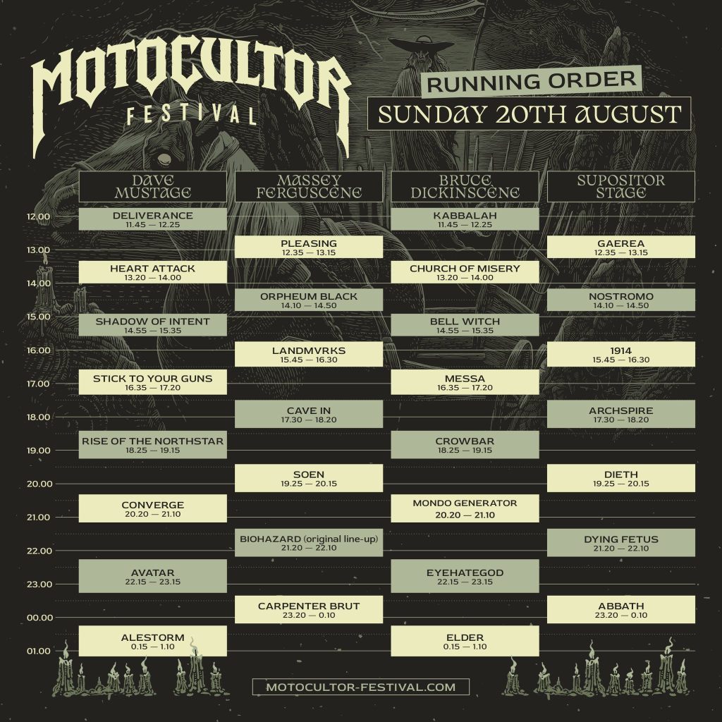 Moonreich (remplaçant 1914) † ABBATH † Archspire † Bell Witch † Biohazard (Original Line-up) † Carpenter Brut † Cave In † Church of Misery † Converge † Crowbar † Deliverance † Dieth † Dying Fetus † Elder † Eyehategod † Gaerea † Heart Attack † Kabbalah † Landmvrks † Mondo Generator † Messa † Nostromo † Orpheum Black † Pleasing † Rise of the Northstar † Shadow of Intent † Soen † Stick to Your Guns