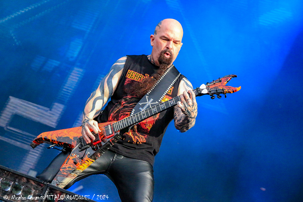 Depuis que le Hellfest s’étend sur quatre jours, le jeudi a des allures de traquenard. On arrive plus tard mais on en fait autant, et on finit sur les rotules à tel point qu’on se demande comment on tiendra le rythme trois autres jours. Bien évidemment, cette impression est fausse. Mais il est vrai que cette première journée écourtée est bien remplie : obtenir son bracelet, charger sa cashless, boire sa première bière (et découvrir que désormais la taille minimum du gobelet est de 56cl – avec un faux col bonus la poussant à 60cl -), faire le tour complet du site pour s’approprier les lieux (découvrir les nouveaux aménagements), rencontrer un tas d’amis et après les avoir enlacés chaleureusement s’entendre dire réciproquement « On se capte dès qu’on peut durant le weekend ! » (alors que pour la plupart on ne se reverra plus), et puis évidemment courir devant la première scène selon le running order que l’on aura passé des semaines à personnaliser. Celui-là même qu’on ne parviendra pas à respecter totalement… Parfois avec regret, parfois avec bonheur quand on reste scotché devant un groupe que l’on n’attendait pas. C’est ce qui fait le sel de ce festival. Contrairement à ce que la météo avait prévu quelques jours auparavant, il fait diablement chaud sur le site aujourd’hui (pour quelqu’un qui vit sous la pluie depuis des mois !), la sueur vient même à perler le long de ma colonne vertébrale, il y là quelque chose qui tient du miracle. Ou de l’Enfer. Le site est bien (trop) peuplé pour un jeudi, et c’est annonciateur d’une jauge dont les contours resteront comme chaque année flous. Running order, donc (stay focused) ! Nos pas nous mènent jusqu’à la Valley pour débuter le weekend par les fondamentaux du style musical qui a bercé notre vie avec les bretons de Komodrag & the Mounodor qui, avec force (entre autres) pattes d’éph’ et pilosité faciale surdéveloppée à défricher, nous entrainent aux racines du hard-rock en faisant revivre les années 70 avec un entrain et une joie hautement communicatifs. On s’y croirait ! Festive à souhait, leur musique conjugue en live les ingrédients propres à embraser une assistance particulièrement fournie ! Une vraie belle découverte pour ouvrir les hostilités. De la Valley à la Warzone, il n’y a – littéralement – qu’un pas (sous le regard bienveillant de Lemmy), et les festivités s’enchaînent brillamment en mode grand écart avec les suédois de Thrown qui distillent un hardcore énergique, avec ses bons et mauvais côtés : de gros riffs…. et déja les morceaux sont finis. Non seulement c’est efficace, c’est aussi dynamisant. En hommage certainement à la Bretagne, le batteur joue en marinière et le guitariste sous un k-way avec capuche (le pauvre, lui aussi doit sentir la sueur perler dans le dos !). Deux scènes, deux ambiances, le Hellfest 2024 est lancé ! Un passage écourté ensuite sous la Temple sans être convaincu par le doom / dark ambient très statique et linéaire des allemands de (DOLCH), qu’un ami italien (fan de Yoda) résuma ainsi : « Qui un bon moment passer voulut, (DOLCH) évita ! », et il est déjà 19h30. Slayer d’aller voir Kerry King ! Fort d’un premier album sorti sous son nom il y a quelques semaines, le guitariste emblématique de Slayer se produit déjà au Hellfest sur la mainstage 1… pour cinquante petites minutes qui, passé l’efficace et entraînant « From Hell I Rise » qui donne son nom à ce premier album solo, paraissent une éternité. Tout dans la prestation du groupe pourtant talentueux qui l’accompagne suinte le canada dry, le doppelgänger de chez Wish. De l’attitude des musiciens dont le professionnalisme masque plus ou moins habilement leur statut de salarié, jusqu’aux recettes éculées d’un thrash sans ambition ou encore les flammes en mousse qui jaillissent en volutes sur le devant de la scène. Trop long, trop basique, le set ne prend vie qu’au moment de la reprise de « Raining Blood ». Etre et avoir été. Et pourtant, à l’image de son batteur, Kerry est entouré d’un beau staff. Finira-t-il comme tous les guitaristes dont les initiales sont K.K, condamné à vivoter dans l’ombre du groupe qui l’a rendu célèbre ? Rien n’est moins sûr, si l’on en croit la réaction hystérique des fans de la première heure, à commencer par l’une des amies m’accompagnant, sautillant comme une puce durant tout le set. A sa décharge, il m’appartient de préciser que sa tenue, estampillée Slayer des pieds à la tête, ne laisse planer aucun doute sur sa fanitude indéfectible. Manu, si tu me lis… Resté planté là à la fin du set, abandonné par mes amis, je me trouve malgré moi témoin du « spectacle » qui débute ensuite sur la mainstage 2 : le show de Babymetal… qui ne figurait pas sur mon running order. Je suis en quelque sorte victime de cet enchaînement. Victime consentante malgré elle (?). Que fait la HellWatch ? Rien, débrouille-toi ! Commence alors sous un son moderne et définitivement metal bétonné de grosses guitares un exercice combinant zumba, san-ku-kai, ou encore GRS, réceptionné par le public avec un enthousiasme qui aurait eu de quoi laisser pantois Kerry King s’il n’était pas déjà sous la douche (voire même rentré à San Francisco). Je reste pour ma part tétanisé devant cette prestation pendant vingt bonnes minutes, tandis que démarrent les circle pits. Ma principale interrogation, au-delà de la qualité intrinsèque de cette prestation, est : Kerry King, et la musique qu’il défend et représente, ne viennent-ils pas de prendre un sacré coup de vieux ? C’est tout le paradigme de ma construction musicale qui s’en trouve ébranlé (Je n’ai toujours pas la réponse). Comprenant alors qu’aucune réponse ne me serait apportée par Megadeth, l’heure est venue d’aller me nourrir. Il est 22 h 55 quand, plac