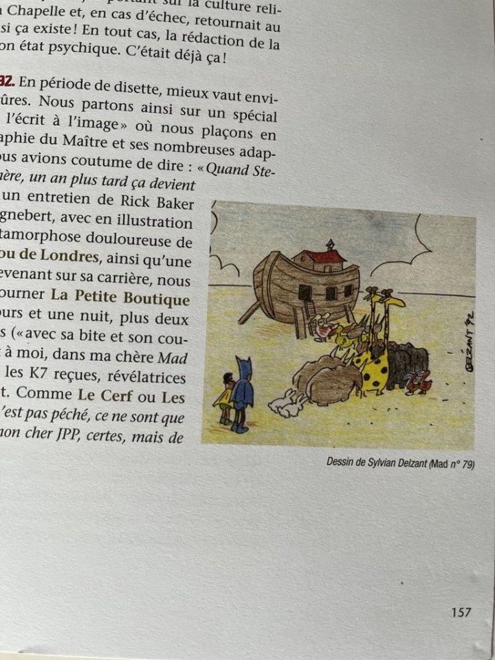 Cela me ramène à cette page 157 de la bio de Jean-Pierre Putters (MAD… ma vie !) dont je voulais vous parler avant de digresser. Eh bien dans le coin bas de la page, que vois-je ? Un dessin de Sylvain Delzant ! Dire qu’un jour je l’avais traîné chez un lettreur de comics dans le New Jersey…