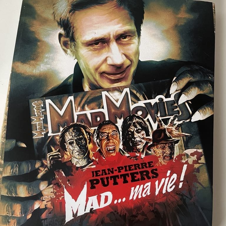 Je continue à progresser dans mes moments libres dans la lecture de la bio du regretté Jean-Pierre Putters (MAD… ma vie !) qui égraine chacun des numéros de MAD MOVIES publié sous sa houlette. Un joli parcours, qui me donne l’impression d’explorer ma jeunesse tant j’y croise à chaque ligne des noms connus, et des connaissances aussi, qui l’ont accompagnée. Cela n’a rien de véritablement nostalgique. Je ne suis pas adepte du « c’était mieux avant », seulement du « c’était avant ». Ca s’appelle le temps qui passe, avec ses bons souvenirs que l’on aurait bien tort de vouloir effacer ou renier, mais que l’on doit choyer comme il se doit, ni plus ni moins que les nouveaux que l’on se crée chaque jour encore heureusement. C’est aussi un « avant » qui perdure délicatement car le temps est un fil, que l’on réalise être ténu plus on avance en âge. À la lecture de cette bio, je me sens complice de ce collaborateur que j’écoute toujours au gré de podcasts, de cet autre qui vit à quelques kilomètres de chez moi et que je n’ai jamais cherché à rencontrer, de cet ami dont je découvre en photo le gâteau de mariage élaboré en son temps par JPP, de cet autre qui m’ouvrit les portes de Metaluna…. Et puis page 157 je prends en peine face le